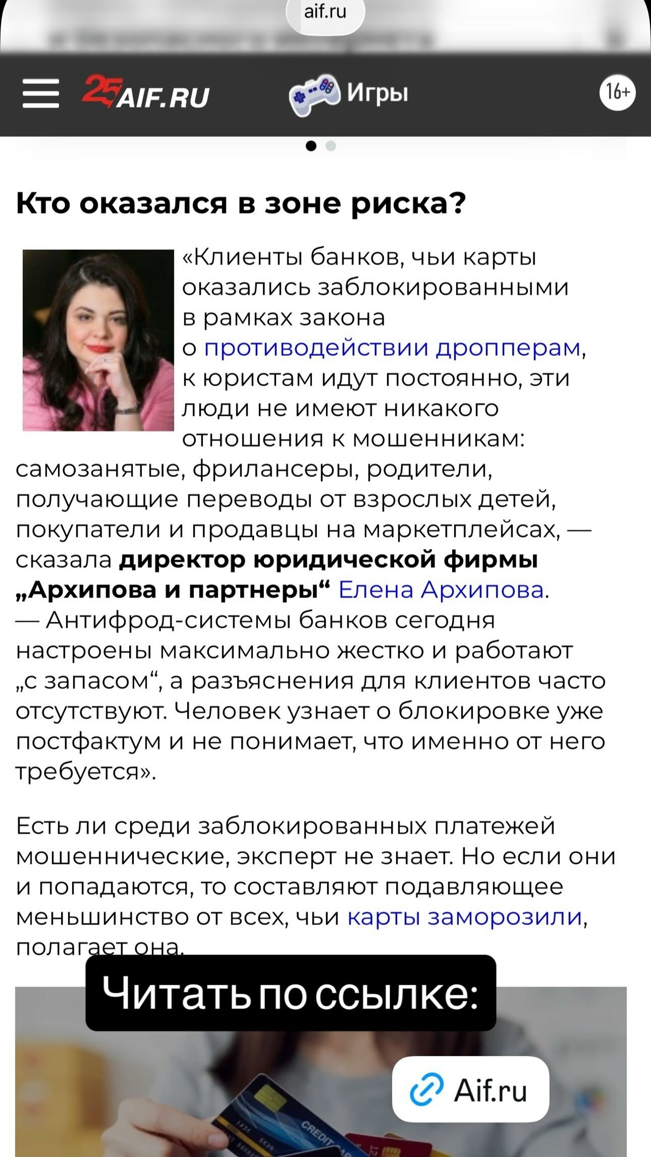 В Аргументы и факты вышел материал о новых рисках блокировки банковских карт по антидропперскому закону с комментариями Архипова Елена, директора юридической фирмы «Архипова и партнёры».